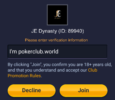 Download the poker app PokerBros, register an account, and request access to JE Dynasty by clicking the Get Deal button.