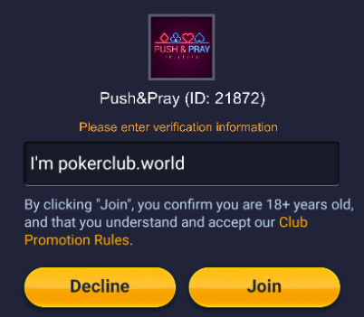 Download the poker app PokerBros, register an account, and request access to Push & Pray by clicking the Get Deal button.
