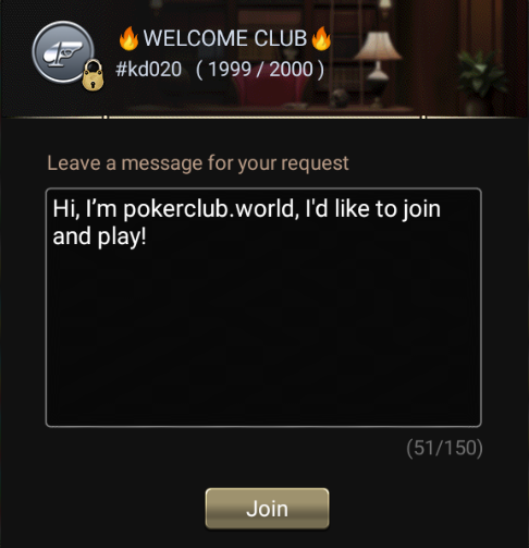 Download the poker app Pokerrrr 2, register an account, and request access to WELCOME CLUB by clicking the Get Deal button.